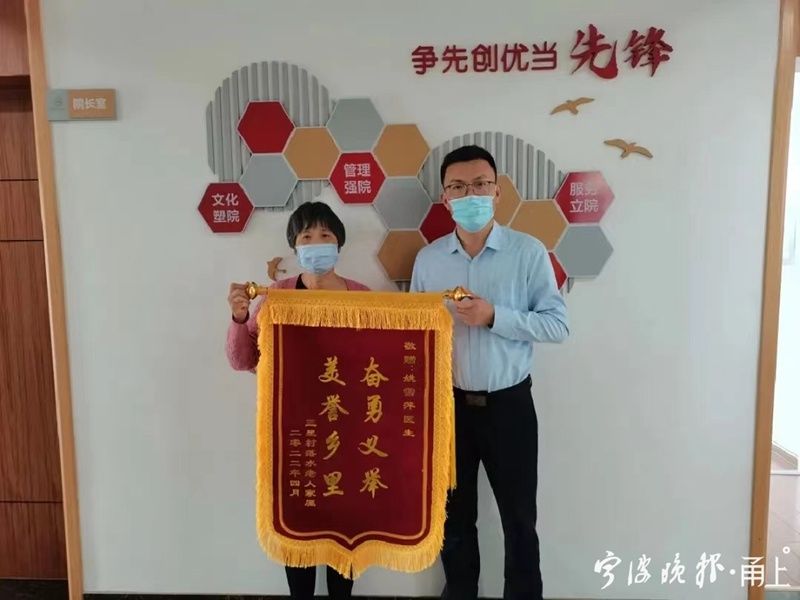 连连道谢的是落水老人的儿子和儿媳,赶到现场时,他们不敢相信是眼前这个身高163CM、体重55KG的女同志,从河里拉回了自己90多岁的老父亲,并跪在地上给老人做了长达40分钟的心肺复苏。当时,在场的只有两三个村里的老人,没有照片,没有视频。直到4月22日,老人的儿子和儿媳拿着一面锦旗找到宁波古林镇卫生院,大家才知道,前虞卫生室的社区医生姚雪萍竟是这样跳河救人的“女汉子”!